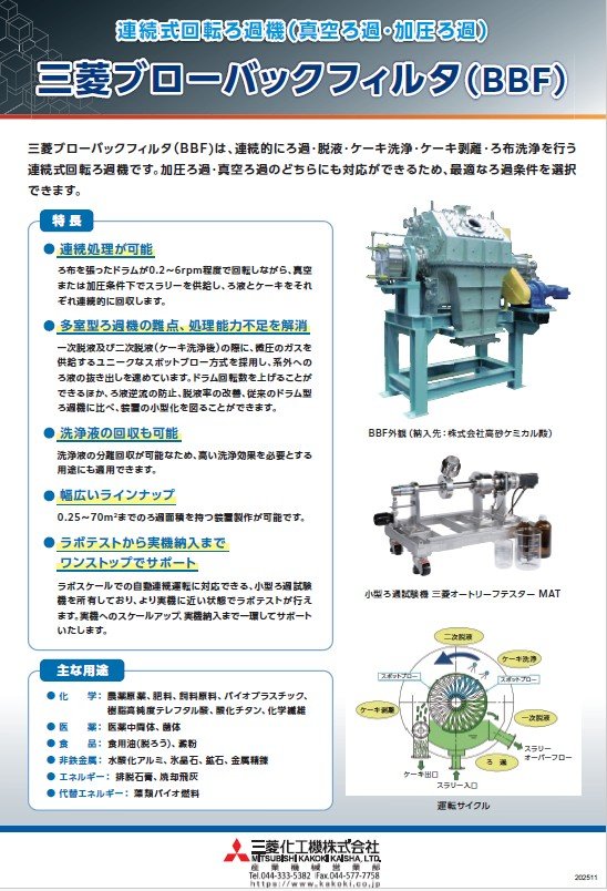 三菱ブローバックフィルタ(BBF)は、連続的にろ過・脱液・ケーキ洗浄・ケーキ剥離・ろ布洗浄を行う、連続式回転ろ過機です。加圧ろ過・真空ろ過のどちらにも対応ができるため、最適なろ過条件を選択できます。