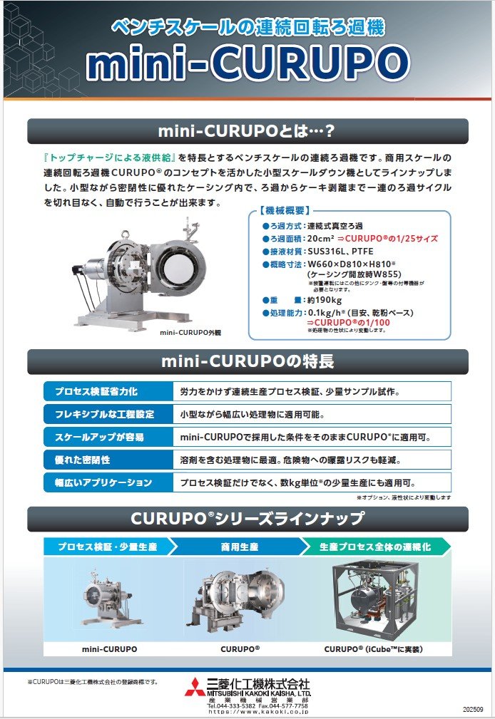 「トップチャージによる液供給」を特長とするベンチスケールの連続ろ過機です。商用スケールの連続回転ろ過機CURUPO®のコンセプトを活かした小型スケールダウン機としてラインナップされました。