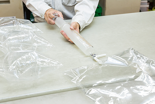 臭気判定士が三点比較式臭袋(排水はフラスコ)法によって行う官能試験法です。
