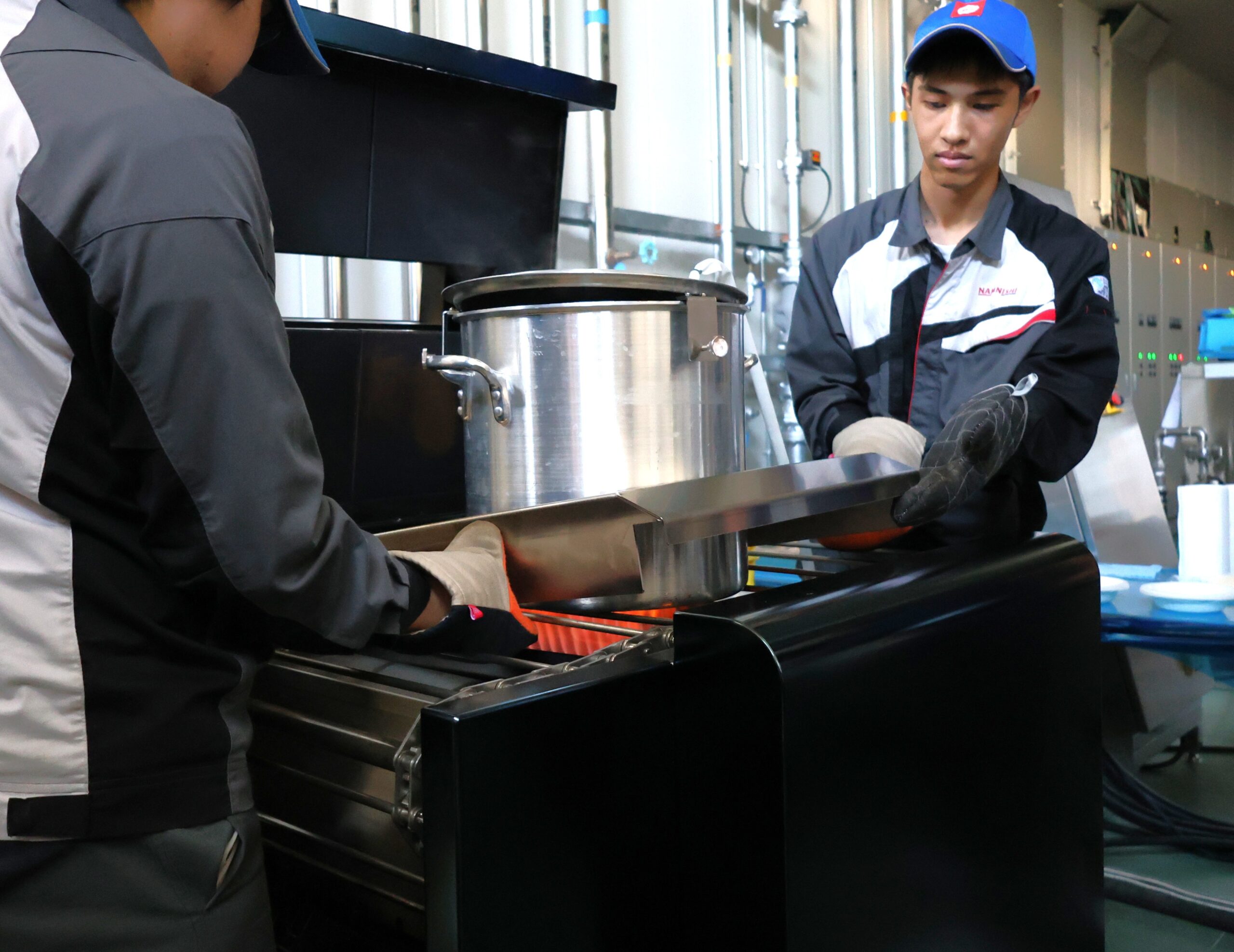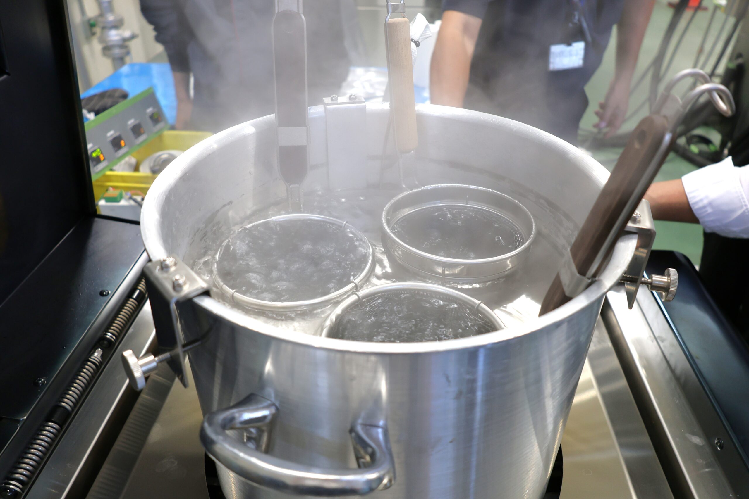 水素オーブンに設置された寸胴鍋を30分ほど前から火にかけ、沸騰してきたころに麺を投入。45秒で茹で上がり、温度計をみるとお湯の温度が98℃まで下がっていた。ここから100℃に戻るまで、なんと45秒! 前回約3分だった結果に比べ、リカバリー時間が約1/4にまで短縮しているとは驚きだ。この作業を3回繰り返し、オペレーションの実証実験が終了した。