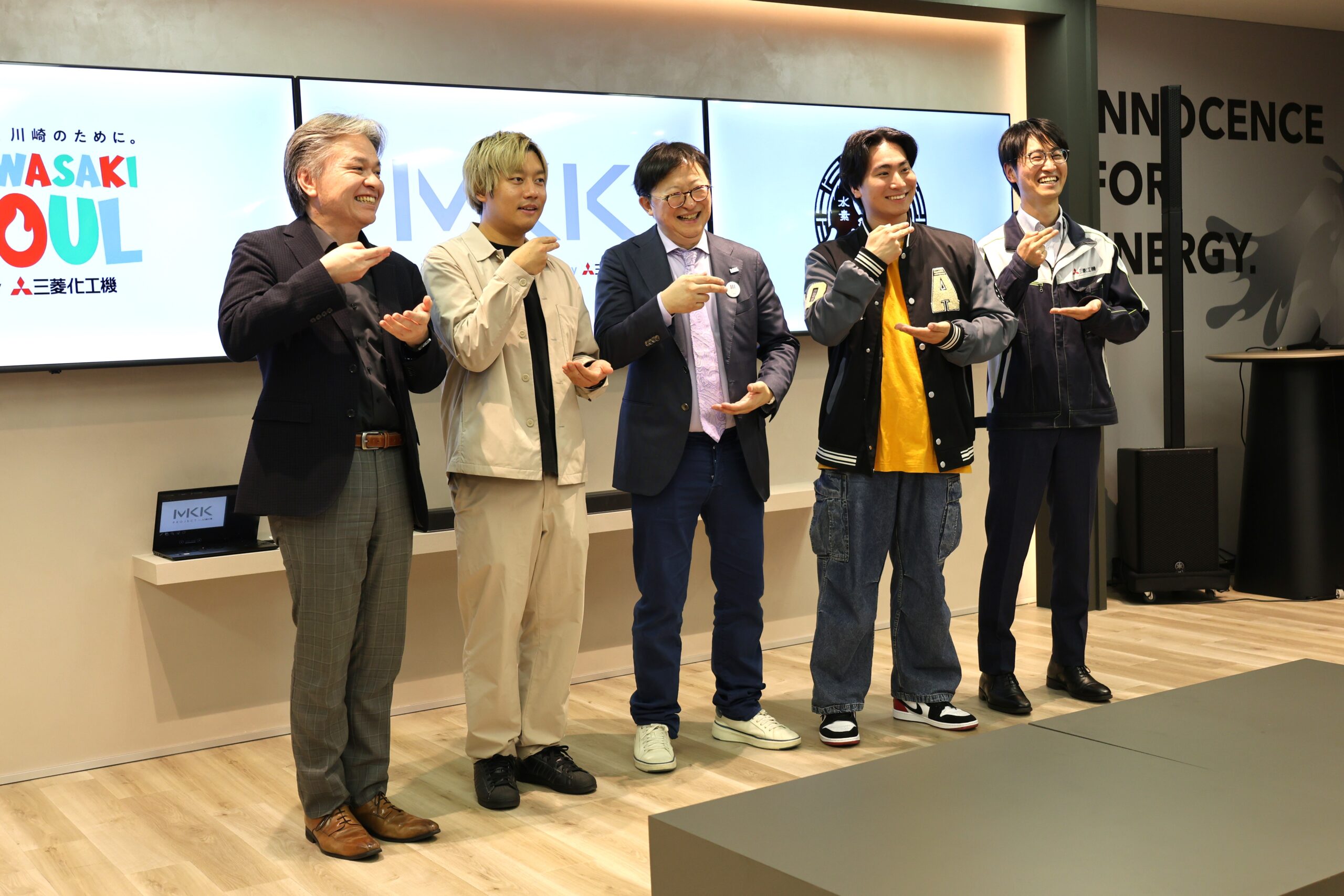 各団体の代表者から概要を発信左から川崎市シティプロモーション推進室の都築直也さん、元祖ニュータンタンメン本舗広報担当の三浦拓真さん、三菱化工機常務執行役員イノベーション推進担当の林安秀、まるっとサステナCAMPの田中悠太さん、三菱化工機水素・エネルギープロジェクト部の今村圭吾。脱炭素ラーメンをいただくポーズで。
